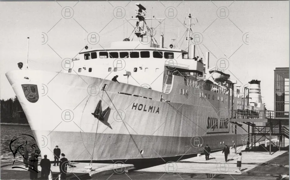 fartyg, Holmia, Silja Line, passagerarfartyg, hamn, sjöfart, svartvit, resande, kryssning, båtliv, transport, marina, hav, lastfartyg, sjö, kaj, turism, historia, 1900-tal, skandinavien, Östersjön