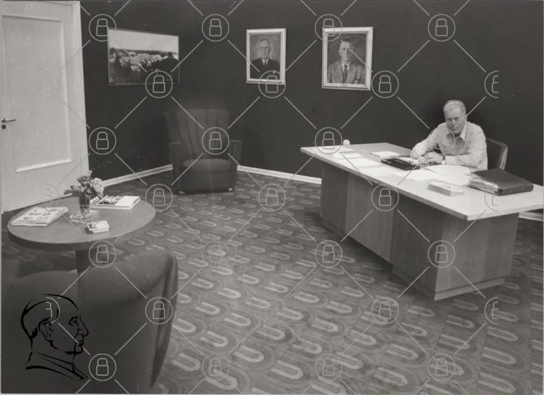 kontor, möbler, skrivbord, stolar, väggar, tavlor, svartvitt, inredning, rum, golv, dokument, papper, fönster, växt, modern, retro, stil, arbetsplats, bekväm, professionell, atmosfär, interiör, design, kontorsmiljö, sittplatser, arbetsrum, kontorsinredning, kontorsutrustning, kontorslandskap, kontorsliv