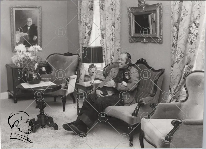 inredning, svartvitt, möbler, soffa, bord, lampa, konst, spegel, man, leende, rum, vintage, stil, blommor, gardiner, fotografi, 1900-tal, interiör, sittande, avslappnad, elegans, retro, klassisk, hemtrevlig, atmosfär, detaljer, textur, komfort, design, kultur