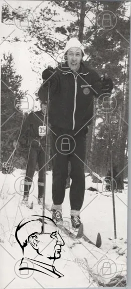 skidåkning, vinter, snö, skidor, tävling, nummerlapp, skidsport, skog, motion, utomhus, män, svart, vit, kläder, sport, natur, trä, kallt, aktivitet, tradition, historisk, 1970-tal, vinteridrott, friluftsliv, snölandskap, skidspår, tävlingskläder, nummer 35, skidåkare