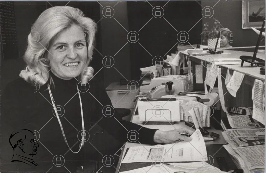 kvinna, leende, kontor, svartvitt, dokument, skrivbord, telefon, papper, anteckningar, kontorsmaterial, hår, kläder, professionell, arbete, administration, kontorsmiljö, skrivmaskin, kalender, växt, kontorsstol, ansikte, uttryck, kvinna i arbete, 1980-tal, retro, affärsmiljö, kontorsutrustning, kontorspersonal, arbetsplats, kontorsliv