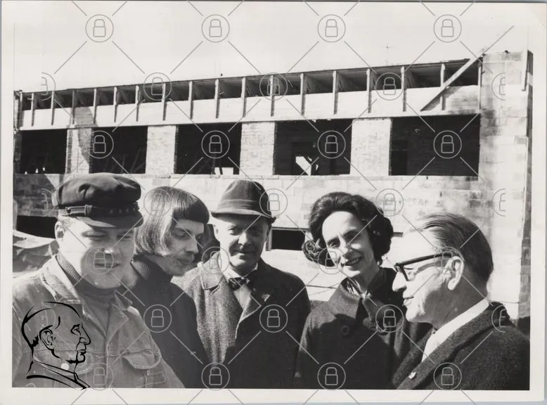 historisk, svartvit, grupp, människor, byggnad, hattar, kläder, 1900-tal, fotografering, leende, män, kvinnor, industri, arkitektur, samarbete, projekt, minnen, tradition, stil, ansikten, interaktion