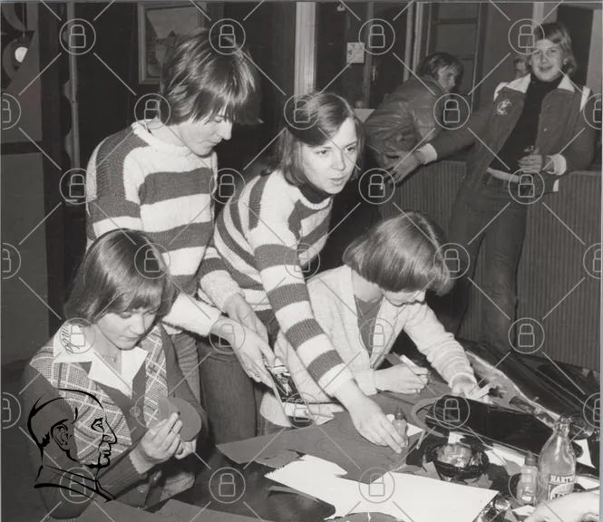 svartvitt, 1970-tal, kvinnor, spel, bord, kläder, stripmönster, frisyrer, socialt, retro, inomhus, aktivitet, samvaro, leenden, kortspel, ungdomar, nostalgi, interaktion, vänner, fest, underhållning, fotografi, grupp, stil, kultur, gemenskap, skratt, minnen, tradition
