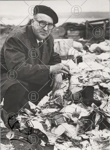 man, fisk, skräp, miljö, avfall, 1900-tal, svartvit, kläder, glasögon, hatt, natur, insamling, skräpfisk, hållbarhet, fotografering, historia, landskap, industri, arbete, tradition, kultur, samhälle, miljöskydd, återvinning, forskning, dokumentation, människa, föremål, hand, sittande, omgivning