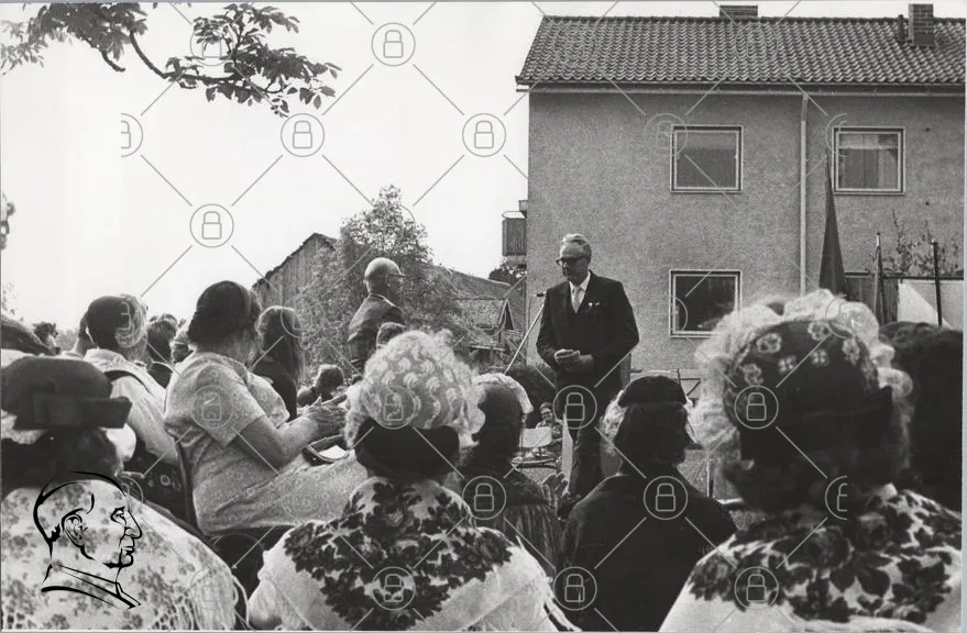 svartvit, människor, kläder, fest, utomhus, byggnad, träd, samling, tradition, 1960-tal, hattar, kvinnor, män, sittande, ceremonin, fotografering, samhälle, kultur, historisk, evenemang, glädje, minnen, familj, vänner, stil, landskap, bakgrund, ansikten, uttryck, samhörighet