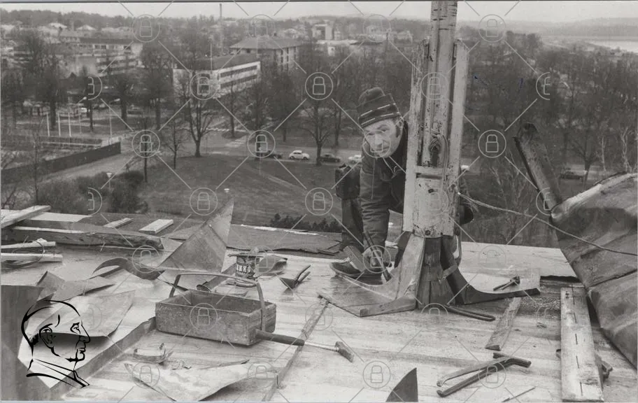 tak, byggnadsarbetare, verktyg, byggmaterial, takläggning, man, arbete, byggarbetsplats, svartvitt, utsikt, stad, träd, bilar, plattor, säkerhet, hjälm, hantverk, konstruktion, takplåt, gammal bild