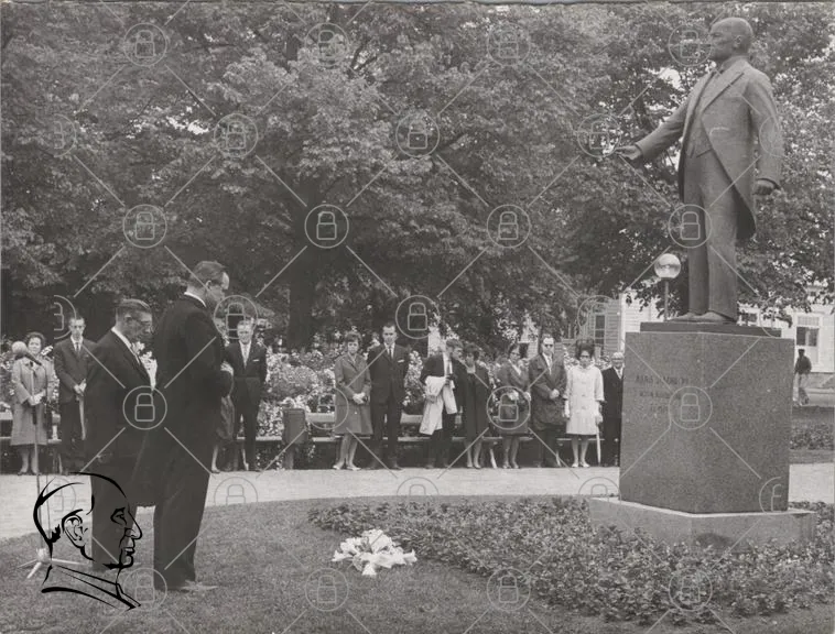 staty, park, människor, ceremoni, blommor, träd, kläder, svartvitt, minnesstund, monument, historisk, samling, offentlig, hyllning, tradition, kultur, 1960-tal, grupp, respekt, natur, staty av man