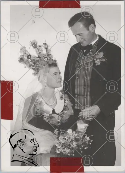 bröllop, brud, brudgum, traditionell, kläder, blommor, huvudbonad, slöja, porträtt, svartvitt, fest, kärlek, romantik, bröllopsbukett, smycken, leende, folkloristisk, par, ceremonin, 1940-tal, vintage, kultur, glädje, familj, firande, stil, elegans, historia, minnen