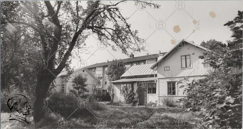 hus, träd, grönska, gård, byggnader, fönster, tak, landskap, svartvitt, natur, arkitektur, gräs, växtlighet, bostäder, utomhus, sommar, gammal, stil, lugn, miljö, kvarter, hem, traditionell, tomt, skugga, historia, landsbygd, detalj, vy