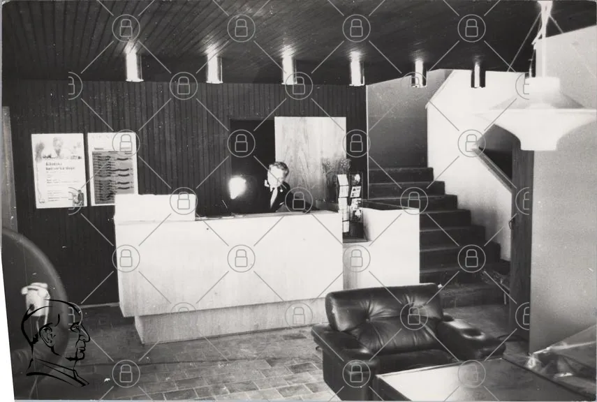 reception, kontor, svartvitt, 1960-tal, möbler, lampa, trappa, vägg, växt, skrivbord, receptionist, lounge, sittgrupp, inredning, design, modern, byggnad, kontorsmiljö, stil, retro, arkitektur, belysning, tidlös, professionell, arbetsplats, service, kundmottagning, affär, hotell, väntrum