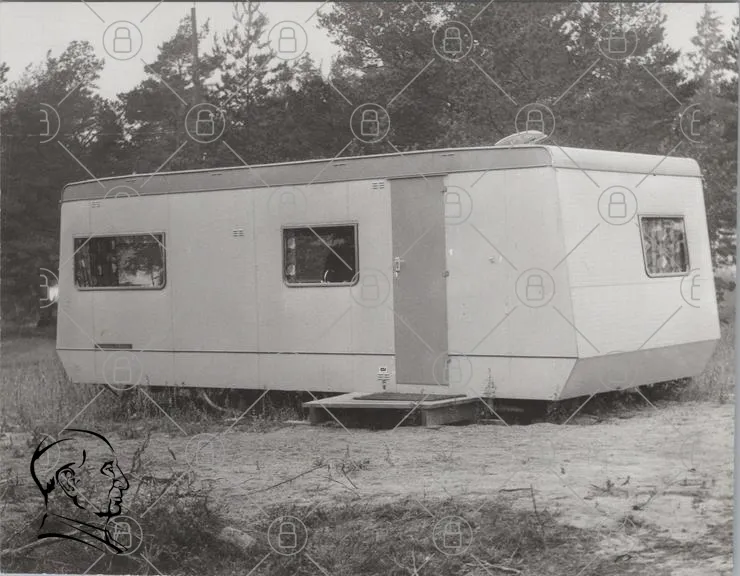 husvagn, camping, natur, träd, skog, utomhus, semester, fritid, byggnad, vit, fönster, dörr, mark, landskap, enkel, retro, stilla, avskild, transportabel, boende, minimalistisk, sommar, avkoppling, resor, svensk, traditionell, enkelhet, friluftsliv, campingliv, husvagnssemester