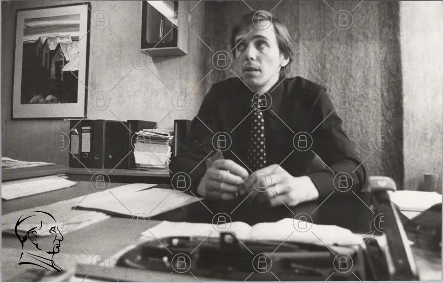 man, kontor, skrivbord, svartvitt, kläder, slips, papper, dokument, kontorsmaterial, bänk, ansiktsuttryck, 1970-tal, inredning, kontorsstol, pappershögar, kontorsmiljö, professionell, eftertänksam, manlig, arbetsliv