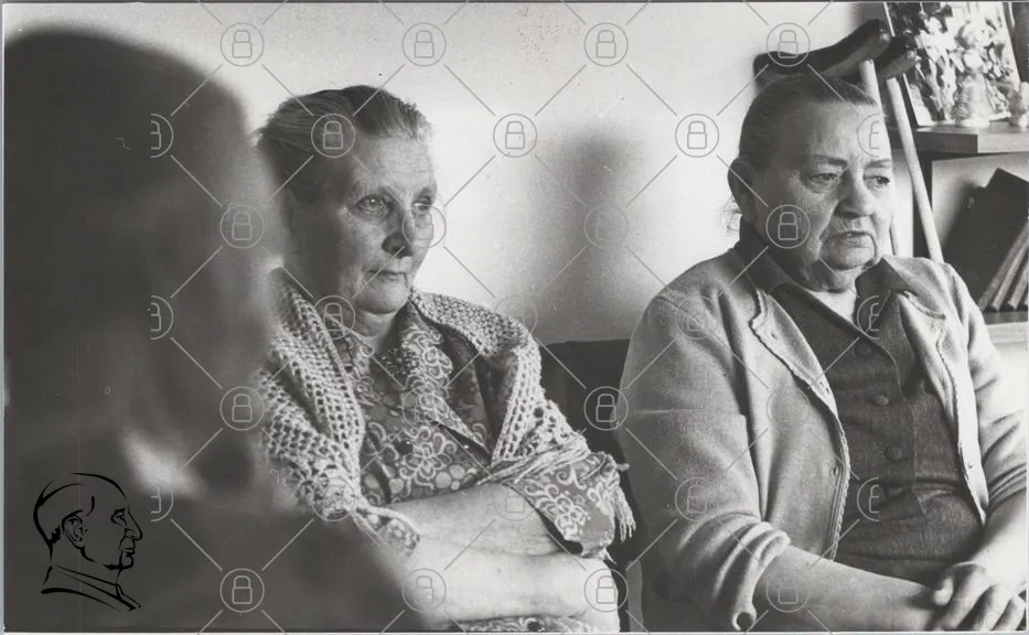 kvinnor, äldre, svartvitt, porträtt, ansikten, kläder, inomhus, uttryck, generationer, kultur, tradition, samvaro, minnen, historia, fotografi, nostalgi, samhälle, livserfarenhet, interaktion, känslor, stil, tidsepok, ansiktsuttryck, kroppsspråk, gemenskap, ålder, visdom, reflektion, lugn