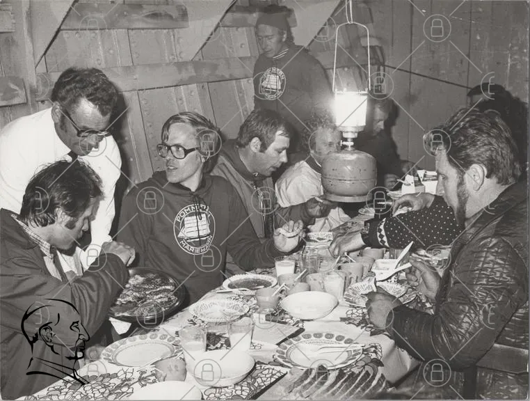 mat, människor, bord, måltid, lampor, kläder, samtal, fest, svartvitt, inomhus, tallrikar, koppar, gemenskap, vinter, aktiviteter, tradition, skägg, glasögon, skämt, skratt, värme, samvaro, tystnad, kultur, historia, natur, utomhus, trä, hus, stämning