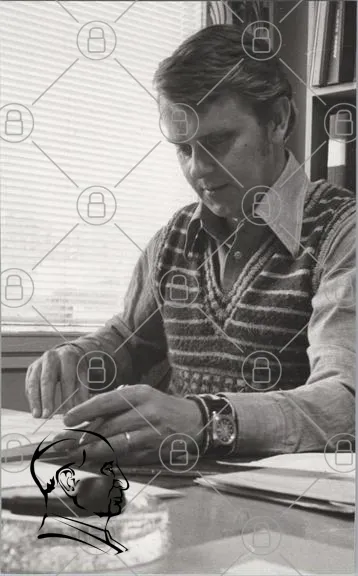 man, skrivande, kontor, 1970-tal, kläder, glasfönster, papper, penna, klocka, koncentration, svartvitt, inomhus, arbete, stil, ansiktsuttryck, hand, skrivbord, dokument, professionell, retro, vintage, manlig, fokus, kreativitet, design, skiss, planering, kontorsmiljö, arbetsliv, tid