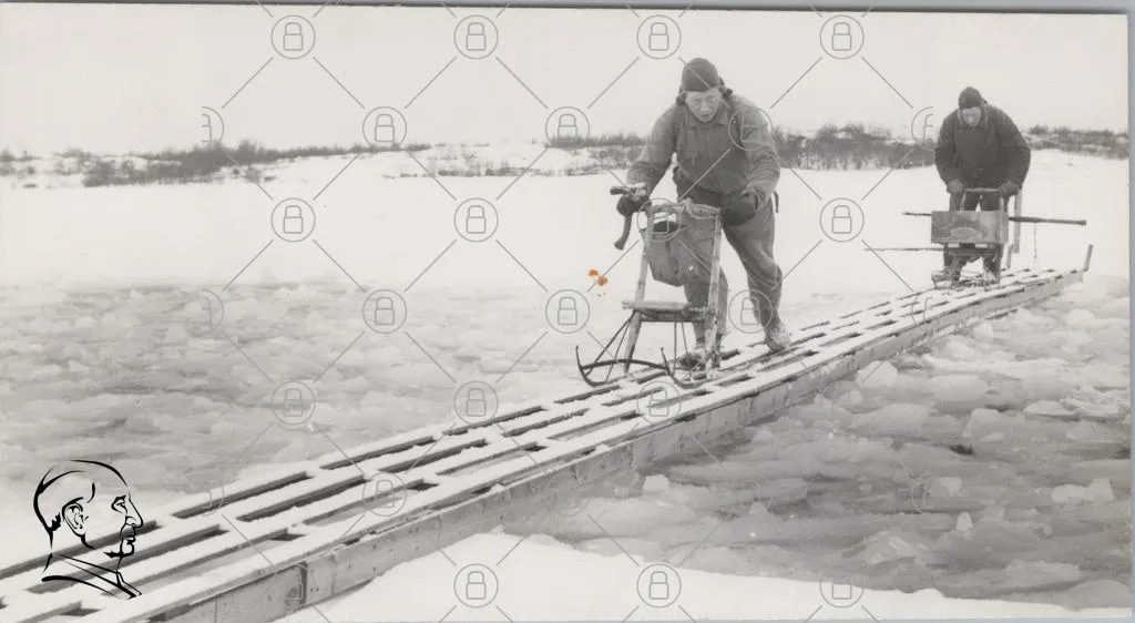 snö, is, vinter, man, skidor, utrustning, friluftsliv, natur, kallt, landskap, träbro, fiske, sport, aktivitet, snölandskap, fryst, avstånd, snöskoter, kläder, fotspår, isflak, snöfall, utomhus, äventyr, tradition, hobby, rekreation, miljö