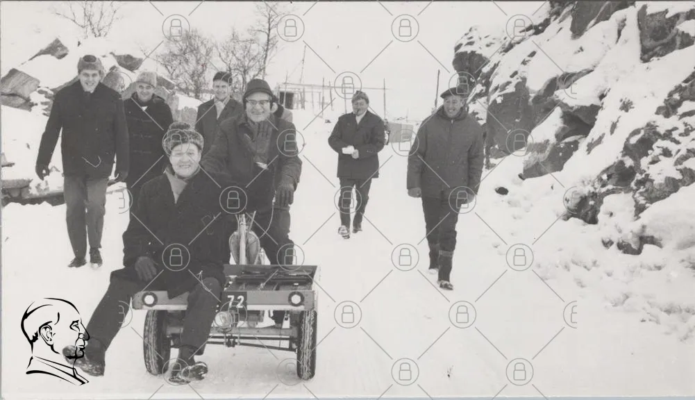 snö, vinter, människor, fordon, gammal, svartvitt, landskap, kläder, skratt, väg, träd, berg, grupp, cykel, 1970-tal, tradition, nöje, utomhus, aktivitet, gemenskap