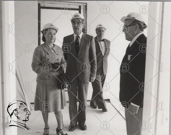 byggarbetsplats, besök, säkerhets hjälmar, kvinnor, män, kostymer, 1960-tal, svartvitt, arkitektur, planering, möte, byggprojekt, inredning, professionella, samarbete, diskussion, byggmaterial, entreprenörer, ledarskap, framtid, utveckling, inspektion, tradition, stil, formell, grupp, interiör, konstruktion, projektledning