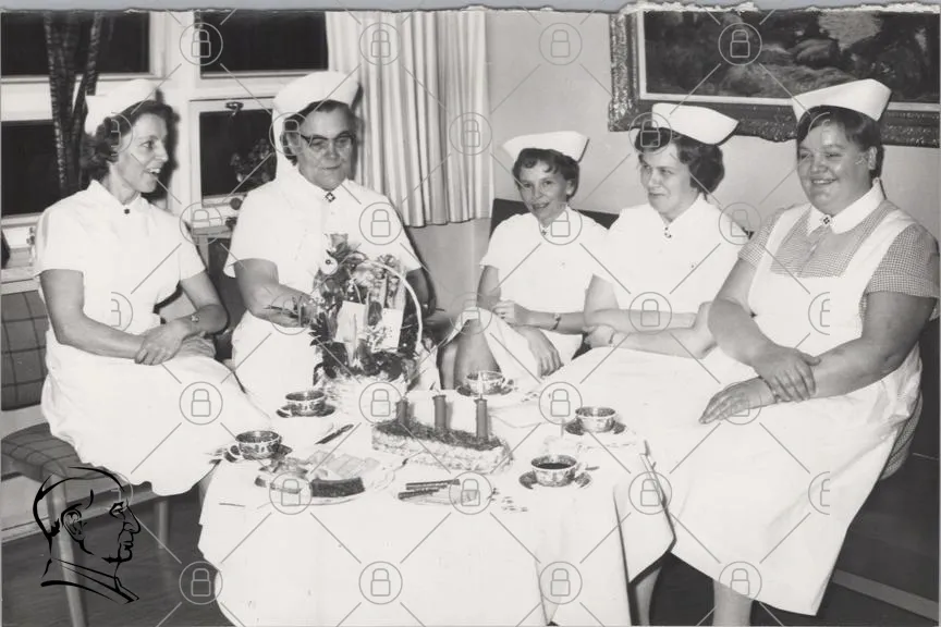 sjuksköterskor, fest, tårta, blommor, te, kakor, 1950-tal, svartvitt, firande, kläder, sjukhus, personal, leende, bord, dekorationer, tradition, gemenskap, vård, kvinnliga, uniformer