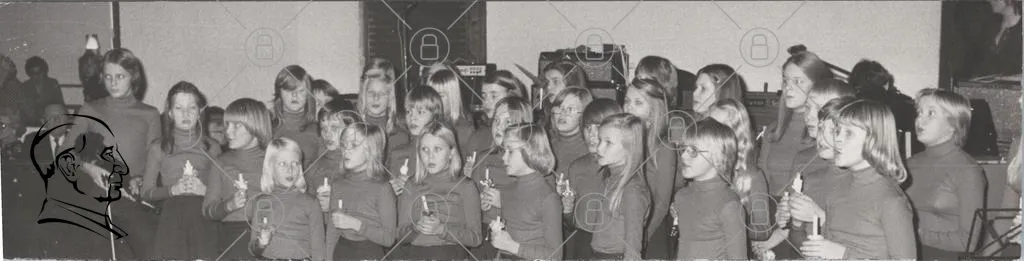 barn, kör, sång, ljus, kläder, 1970-tal, svartvitt, musik, uppträdande, flickor, gemenskap, tradition, fest, skola, minnen, ungdomar, glädje, samling, konsert, ljuslyktor, stämning, artister, scen, kultur, nostalgi, gemensamhet