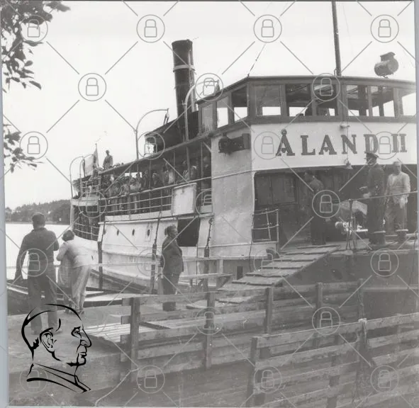 båt, Åland II, passagerare, hamn, träbrygga, vatten, ångbåt, historisk, människor, resande, landskap, svartvitt, 1900-tal, transport, sjöfart, båtliv, sommar, natur, kaj, båtliv, turism, kultur, tradition, foto, nostalgi, ångmaskin, båtfärd, sjö, öar, Sverige