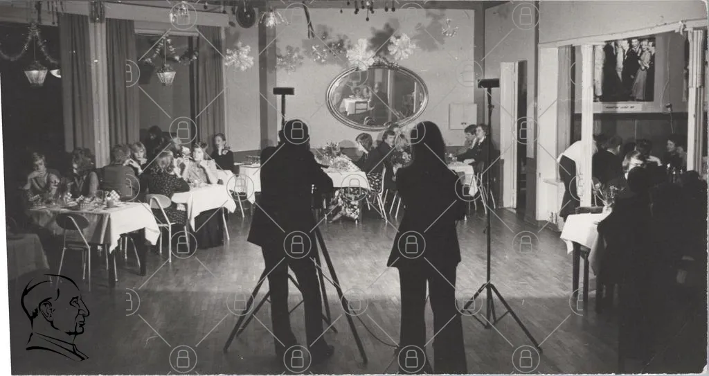 fest, middag, fotografering, spegel, belysning, bord, stolar, klänningar, kvinnor, svartvitt, evenemang, dekoration, festlokal, kameror, samling, socialt, 1970-tal, retro, stil, festligheter