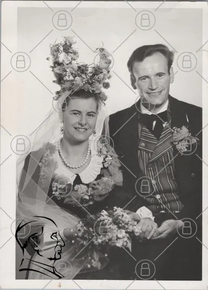 bröllop, traditionell, kläder, blommor, brud, brudgum, svensk, fest, porträtt, svartvit, folkloristisk, huvudbonad, smycken, leende, romantik, kultur, par, ceremoni, handskakning, blommor i håret, vintage