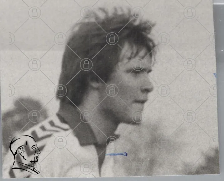 fotboll, spelare, sport, man, svartvitt, profil, hår, tröja, lag, idrott, ansikte, koncentration, rörelse, ungdom, tävling, utomhus, nostalgi, 1980-tal, action, atletisk, energi, passion, prestation, fotbollsdräkt, fotbollsplan, minnen, historia, ungdomssport, laganda, träning