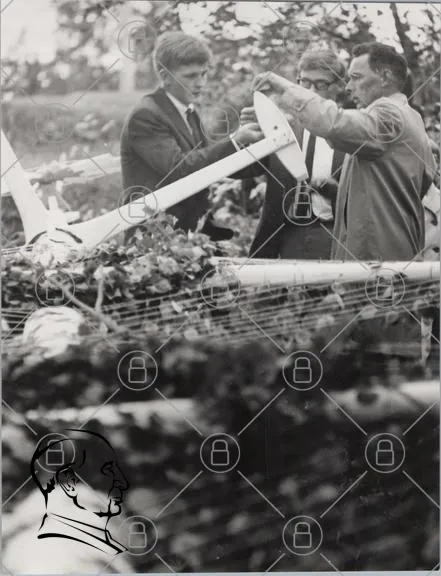 flygplan, människor, diskussion, teknik, ving, grönska, vintage, svartvitt, utomhus, samarbete, forskning, ingenjör, modell, experiment, fält, kläder, 1960-tal, innovation, design, prototyp, träning, utbildning, hobby, intresse, grupp, aktivitet, landskap, natur, detaljer, maskin