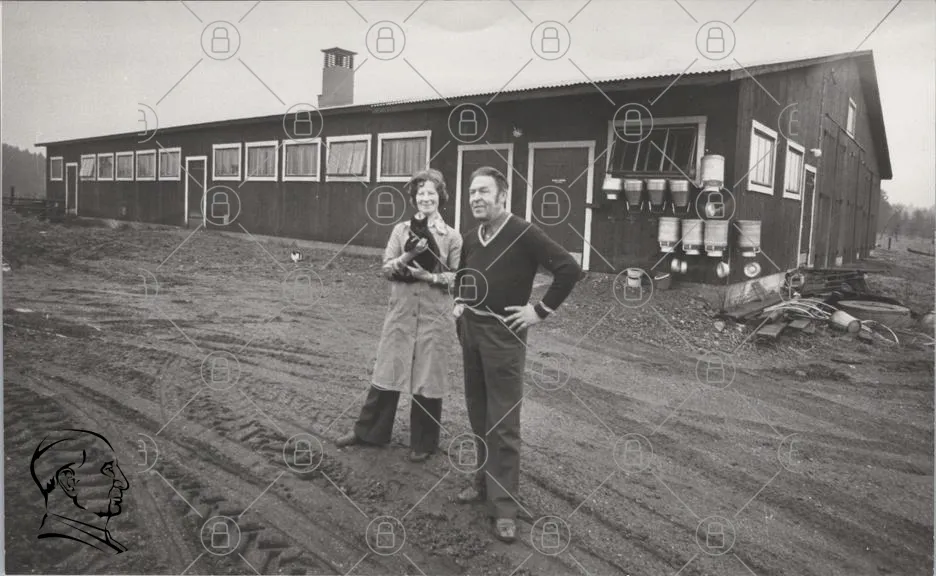 man, kvinna, hund, byggnad, gård, svartvitt, landskap, jord, grus, fönster, dörr, kläder, 1970-tal, utomhus, par, fotografering, natur, traditionell, svensk, miljö, hus, mark, människor, djur, leende, samarbete, historia, rural, gårdsbruk, familj