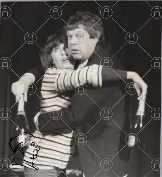 skådespelare, champagne, scen, svartvitt, komedi, teater, kostymer, känslor, humor, föreställning, par, kram, flaskor, 1970-tal, underhållning, publik, skratt, dramatik, kroppsspråk, uttryck, kläder