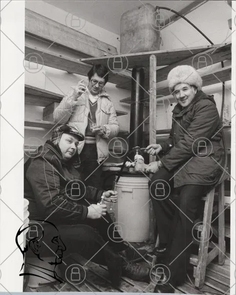 män, verkstad, arbete, verktyg, hyllor, glas, hatt, jacka, skägg, skäggig, sittande, stående, inomhus, svartvitt, 1980-tal, samarbete, hantverk, byggmaterial, bänk, förråd