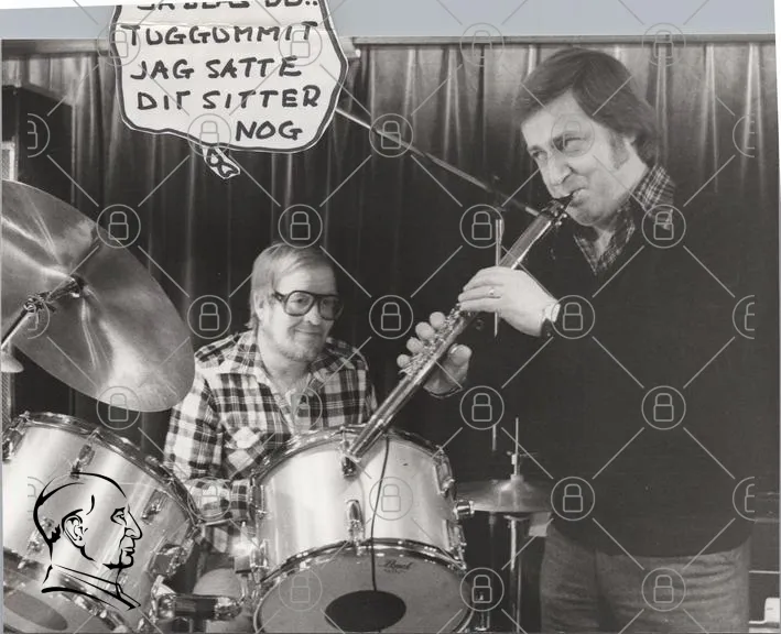 musiker, trummor, flöjt, svartvitt, band, 1970-tal, musik, studio, man, glasögon, skjorta, instrument, retro, fotografi, underhållning, komedi, humor, scen, ljud, rytm, samspel, kreativitet, nostalgi, tuggummi, pratbubbla, text