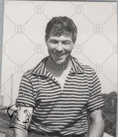 man, leende, svartvitt, randig tröja, vintage, fotografi, 1900-tal, porträtt, utomhus, glad, stil, kläder, ansikte, person, nostalgi, ungdomlig, casual, sportig, manlig, uttryck, minne, historia, kultur, mode, retro, karaktär, naturligt ljus, enkel bakgrund, avslappnad