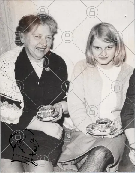 kvinna, äldre, ung, te, kopp, leende, svartvitt, kläder, sittande, interiör, familj, relation, tradition, nostalgisk, ansiktsuttryck, hår, mönster, sällskap, vänskap, generationer, kultur, fika, gemenskap, minnen, historia, samvaro, värme, kärlek, skratt