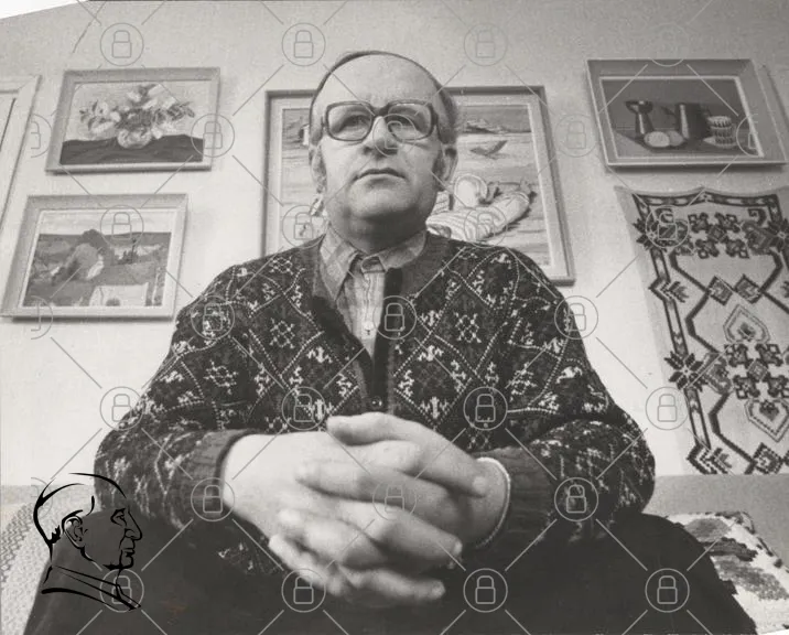 man, glasögon, stickad tröja, konst, tavlor, inomhus, svartvitt, sittande, eftertänksam, rum, möbler, väggar, kultur, porträtt, 1900-tal, fotografi, stil, uttryck, kreativitet, tradition, konstverk, heminredning, personlig, intellektuell, historia, konstnär, atmosfär, detaljer, komposition, fokus