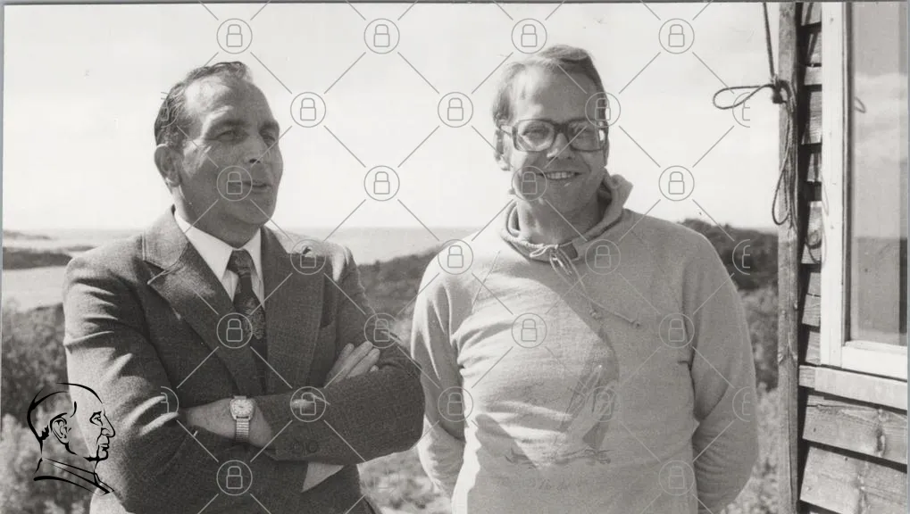 två män, leende, svartvitt, kläder, kostym, tröja, glasögon, hav, kust, vänner, porträtt, avslappnad, bakgrund, natur, 1970-tal, fotografi, ansikten, skratt, gemenskap, mänsklig interaktion, stil, mode, uttryck, minnen, nostalgi, vänskap, samvaro, utomhus, casual