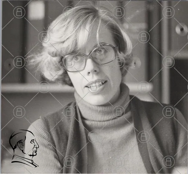 svartvit, kvinna, glasögon, 1970-tal, porträtt, leende, tröja, inomhus, kontor, retro, hår, ansikte, uttryck, stil, mode, vintage, fotografi, personlig, professionell, bakgrund, detaljer