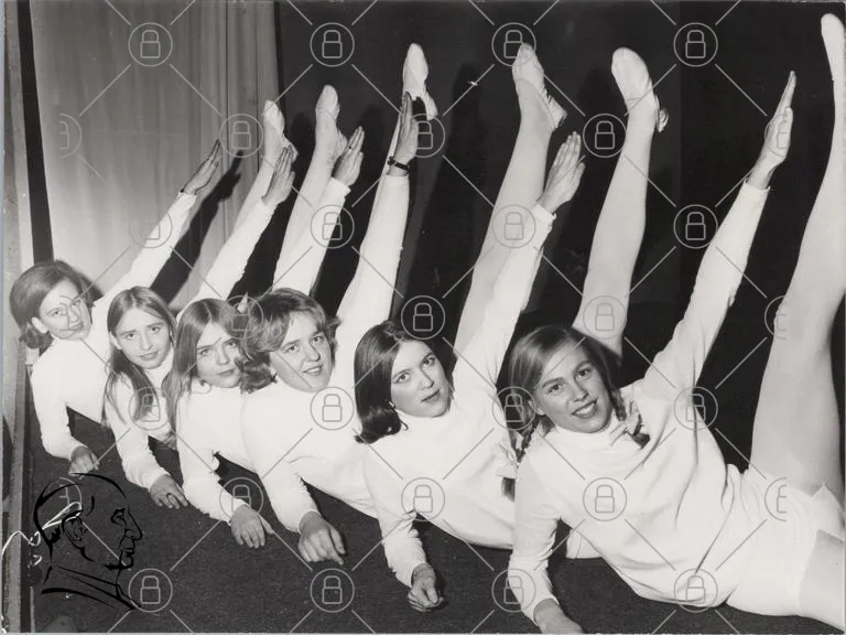gymnastik, tjejer, svartvitt, uppvisning, ben, poserande, kläder, sport, 1970-tal, dans, rörelse, grupp, leende, eleganta, träning, akrobatik, stil, ungdomar, prestation, samarbete