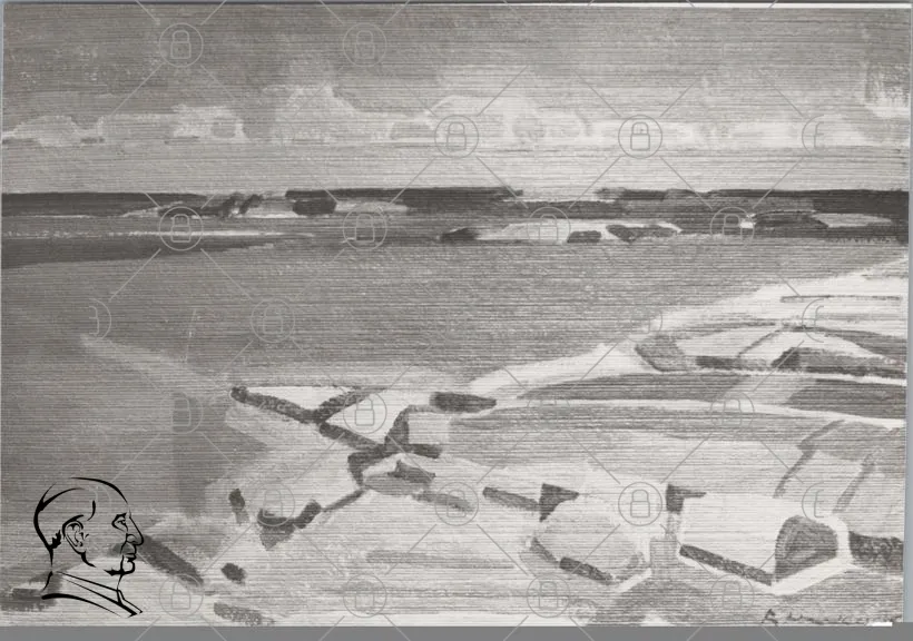 landskap, hav, himmel, moln, svartvit, konst, natur, klippor, vatten, horisont, stiliserad, abstrakt, textur, linjer, skuggor, ljus, perspektiv, fjärran, lugn, stillhet