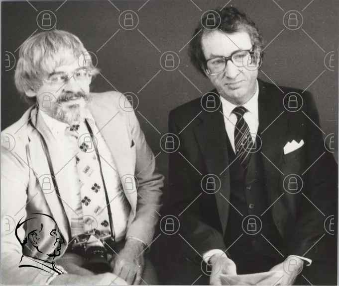 svartvitt, foto, män, kostymer, glasögon, kamera, porträtt, 1980-tal, stil, ansikten, kläder, leenden, bakgrund, professionella, uttryck, vintage, fotografi, två personer, sittande, mänskliga, interaktion, klassisk, retro, mode, personligheter, dokumentär, historia, kultur, tidsepok