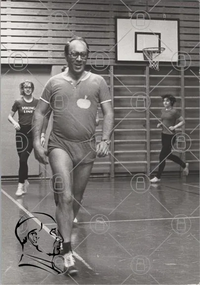 gymnastik, träning, sport, retro, svartvitt, människa, jogging, kläder, skratt, aktivitet, inomhus, 1970-tal, motion, hälsa, gym, lektion, skola, energisk, rolig, grupp, ungdomar, svett, leende, sportkläder, gympasal, viking, linje
