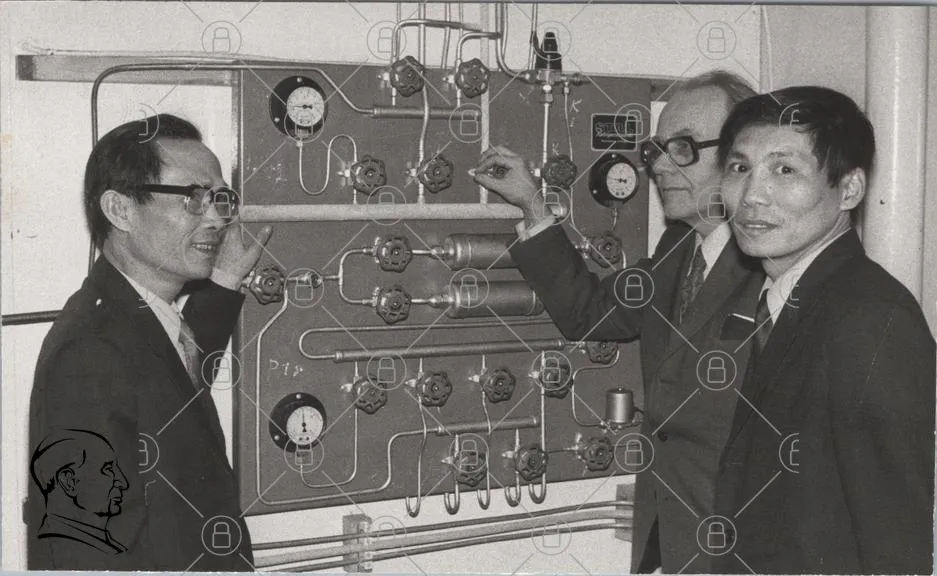 teknik, forskare, experiment, laboratoriemiljö, mätinstrument, rörsystem, tryckmätare, 1970-tal, svartvitt, män, glasögon, vetenskap, innovation, maskiner, forskning, teknikprylar, panel, kontroller, mekanik, industriell, samarbete, presentation, utbildning, teknikforskning, historisk, teknikinnovation, experimentell, forskningsteam, vetenskaplig