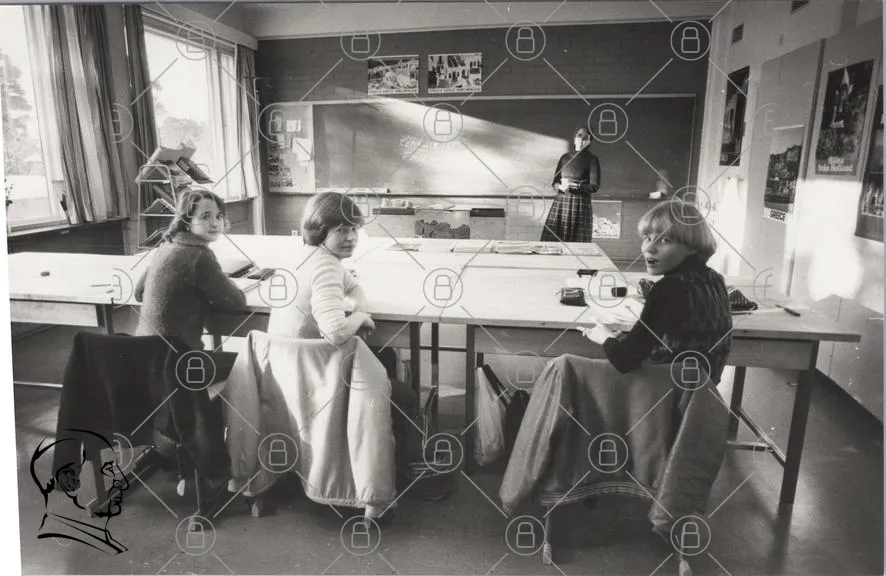 klassrum, elever, lärare, svartvitt, 1970-tal, skrivbord, tavla, skolmiljö, undervisning, kläder, koncentration, lärande, interaktion, skola, utbildning, retro, barn, flickor, pedagogik, studier
