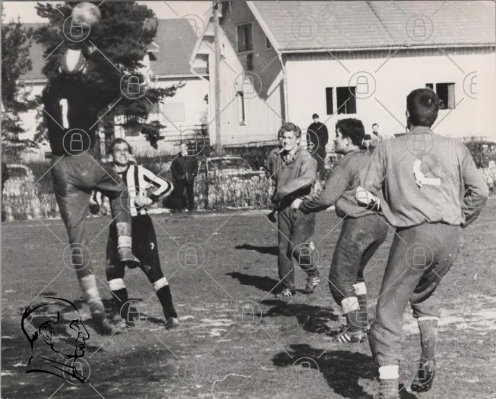 fotboll, spelare, mål, träning, sport, lag, gräs, målvakt, match, 1960-tal, svartvitt, ungdomar, fotbollskläder, utomhus, aktivitet, tävling, samarbete, teknik, rörelse, gemenskap