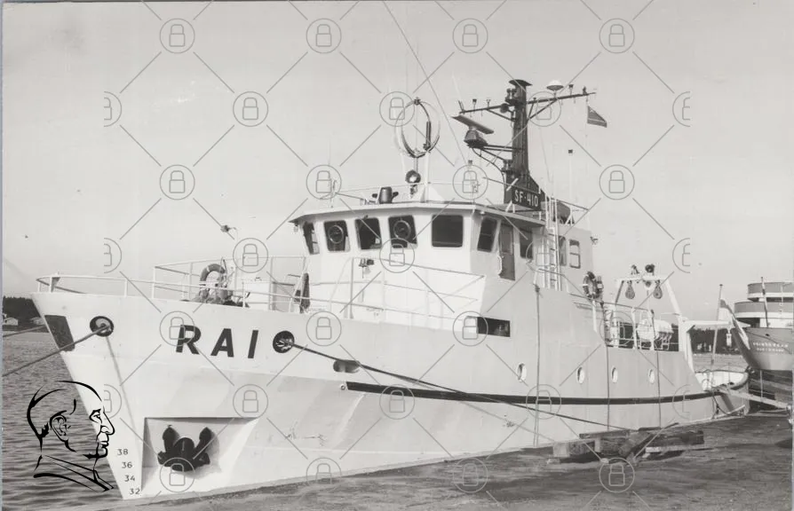 båt, fartyg, skepp, RAIO, SF-410, hamn, marin, navigering, mast, flagga, radar, sjöfart, vit, svartvit, vatten, kaj, utrustning, säkerhet, däck, motor, sjö, transport, fiske, last, hav, kust, industri, teknik, byggnad