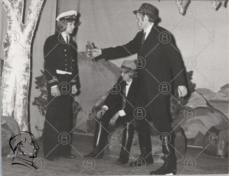 teater, skådespelare, kostymer, scen, 1970-tal, man, kvinna, hatt, marinsoldat, rekvisita, dramatisering, svartvitt, föreställning, publik, dialog, karaktärer, trä, bakgrund, kläder, uttryck, gest, interaktion, roll, tradition, underhållning, historia, kultur, scenkonst, performance, teaterkonst