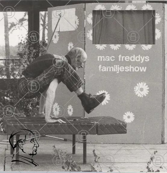 man, akrobatik, show, scen, svartvitt, familj, underhållning, mac freddys, blommor, gymnastik, balans, kläder, sko, prestation, publik, föreställning, 1960-tal, artist, cirkus, komedi, rolig, tradition, kultur, barn, leende, kreativitet, rörelse, konst, uttryck, sport