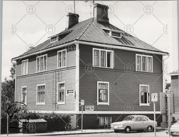 hus, byggnad, fönster, tak, gata, bil, trädgård, skylt, svartvit, gammal, arkitektur, bostad, hörn, väg, stadsbild, 1960-tal, Sverige, landskap, fasad, takpannor, grönska, fotogen, historisk, kvarter, stadsdel, kulturarv, renovering, urban, miljö, detaljer