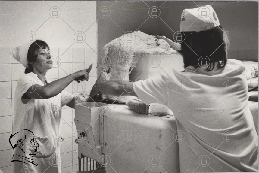 bakning, kök, mjöl, deg, bröd, bakmaskin, kvinna, man, arbetskläder, 1970-tal, svartvitt, hantverk, matlagning, restaurang, professionell, ingredienser, traditionell, bakverk, teamwork, industriell, köksutrustning, kreativitet, arbetsmiljö, mat, kultur, hantverksmässig, process, råvaror, bakningsteknik